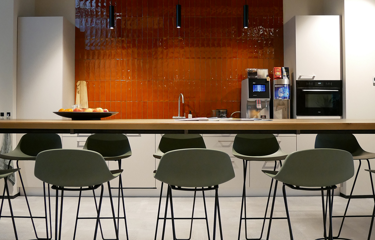 Tafels met conische onderstellen, moderne wandbanken, nisbanken en vergadertafels. Voor dit project mochten we ook weer veel van onze mogelijkheden uit de kast halen.